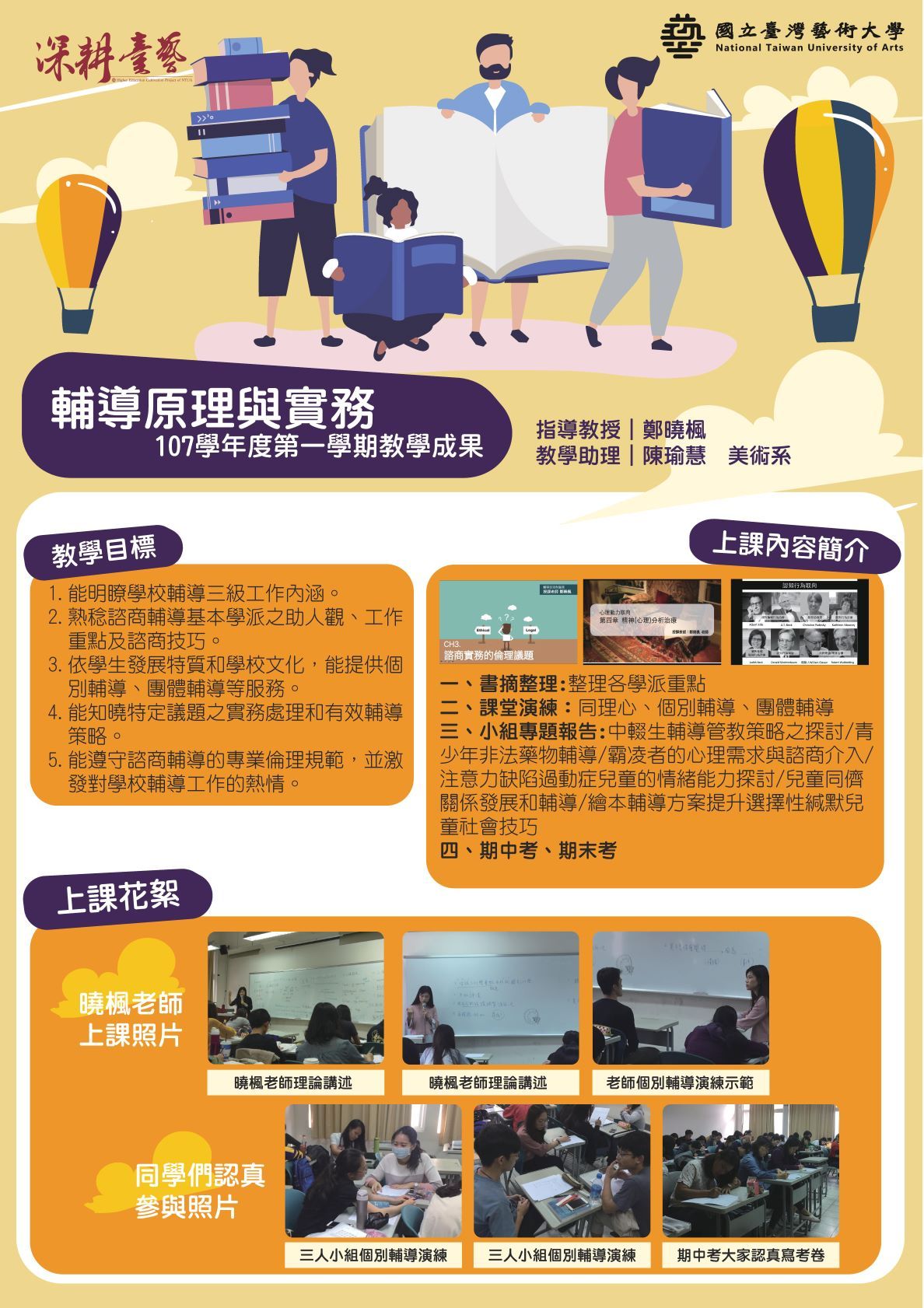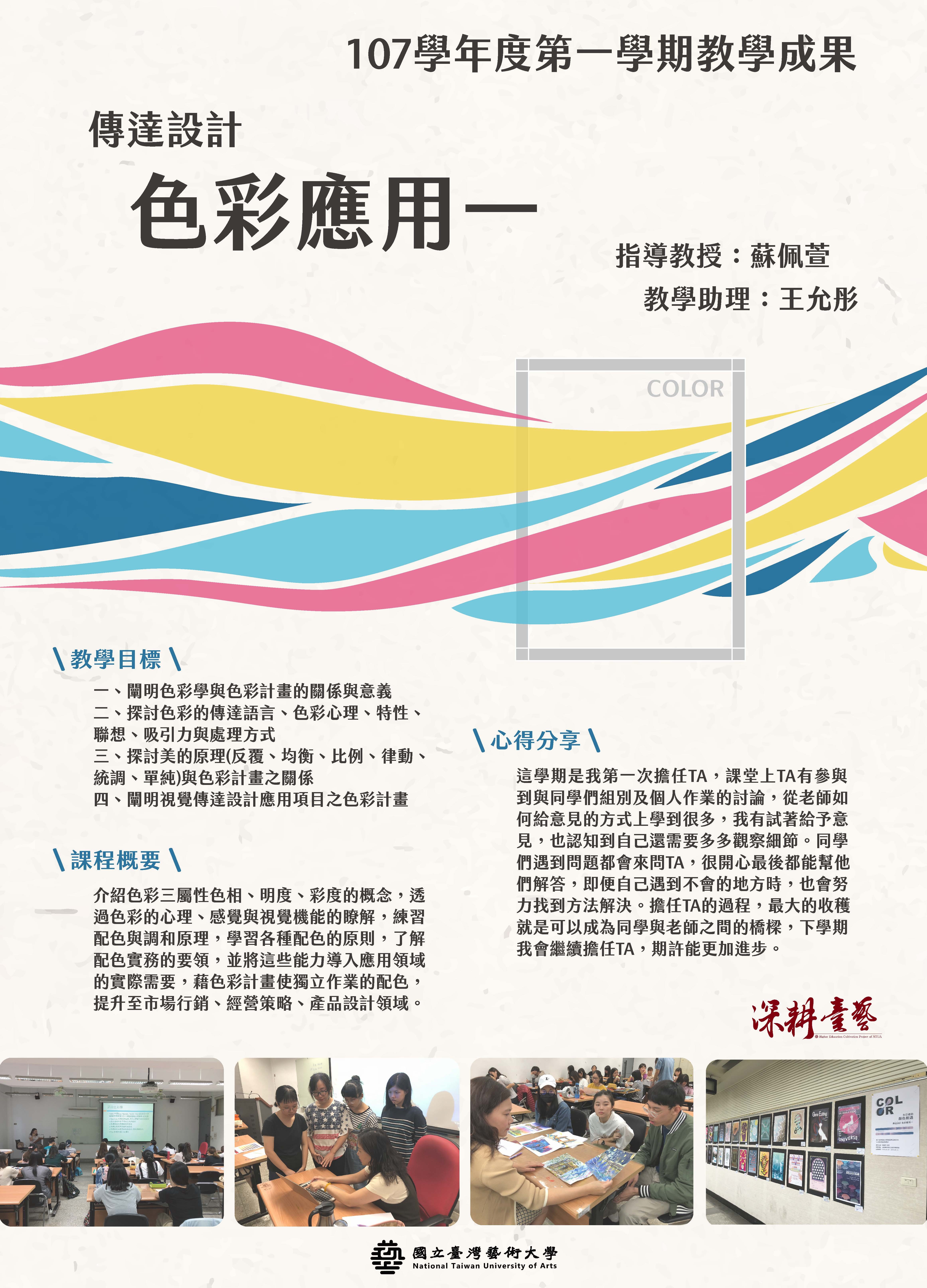 傳達設計色彩應用 授課教師:蘇佩萱老師/教學助理:王允彤 產品設計工作坊 授課教師:劉立偉/教學助理:林鈞棟 輔導原理與實務 授課教師:鄭曉楓/教學助理:陳瑜慧