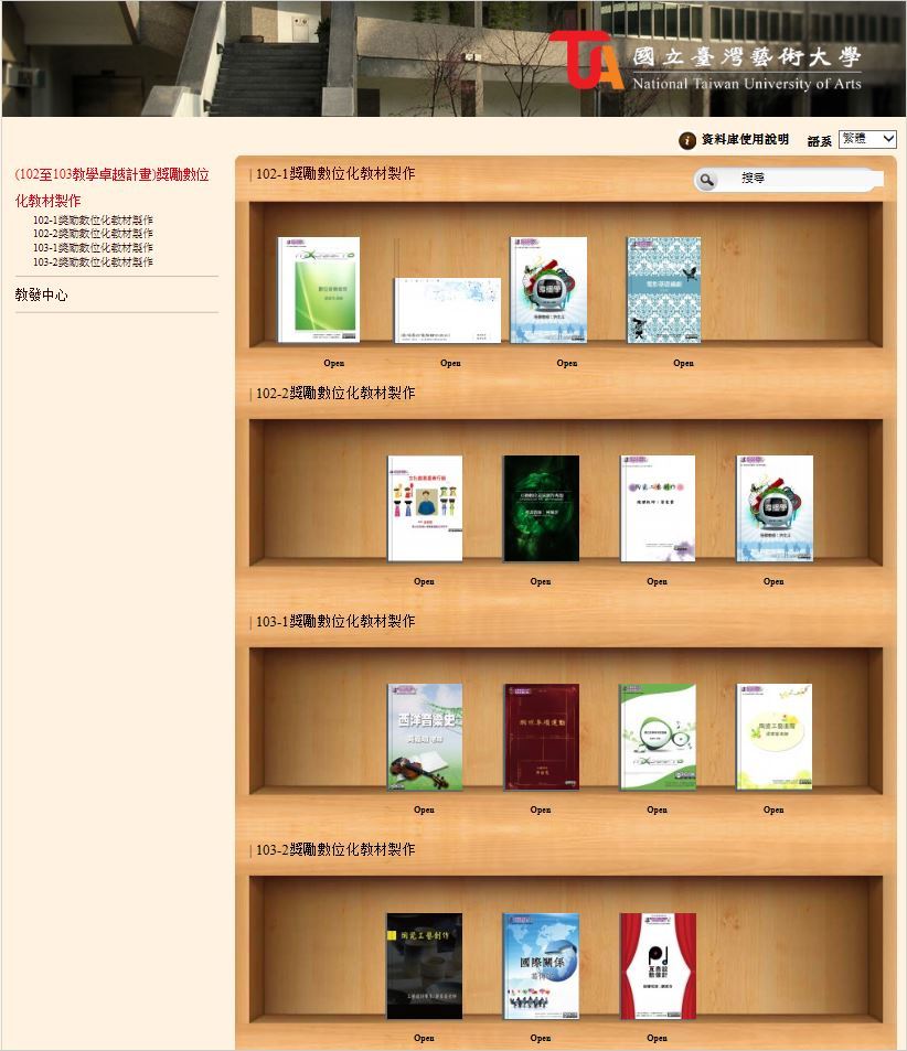 本校104-105年度教育部獎勵教學卓越計畫 1-1分項「多元教學文創啟藝計劃」為獎勵教師「數位化教材製作」,自102-1學期起,精選多門課程跟拍錄製完整18週課程並製作成電子書,103-2學期之電子書成果目前皆已上櫃,歡迎閱覽。