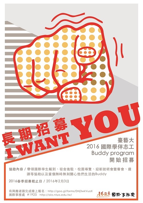 首頁> 各項業務執行單位> 最新消息> 臺藝大2016年境外交換生Buddy Program招募!